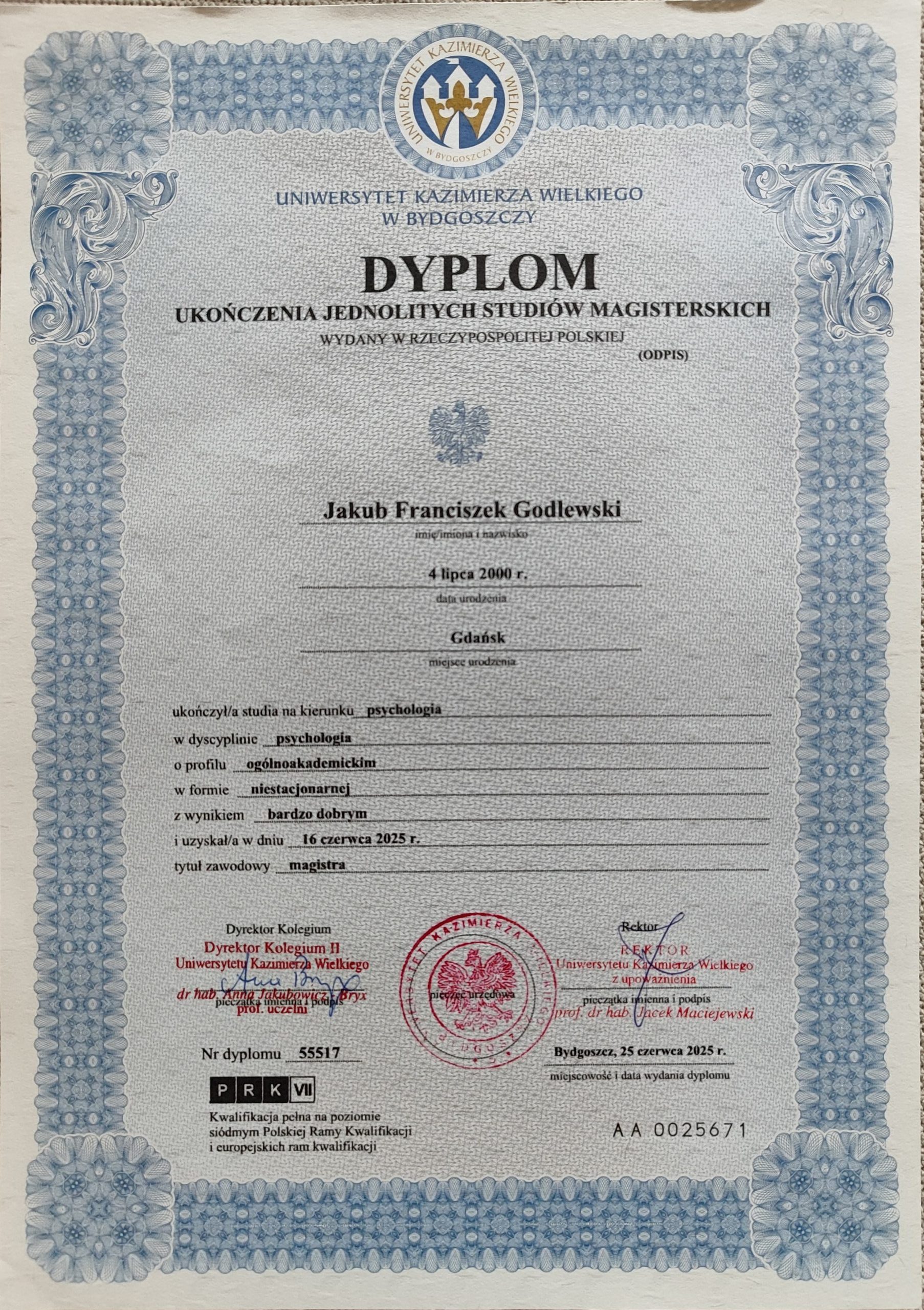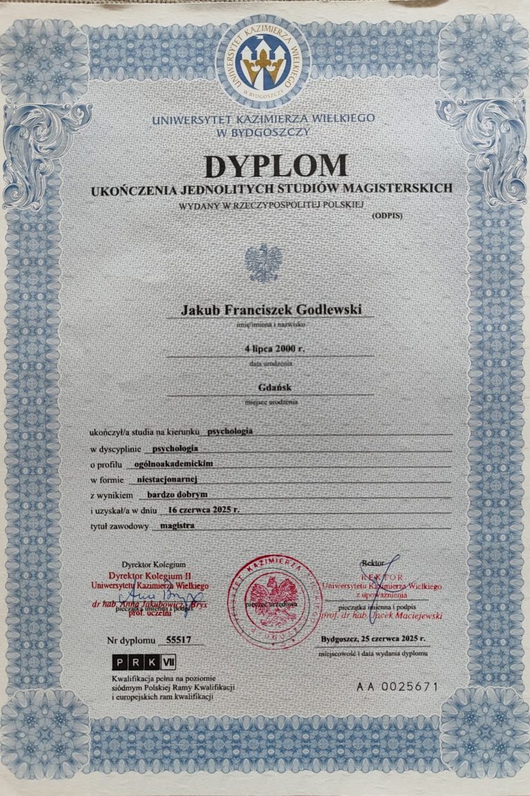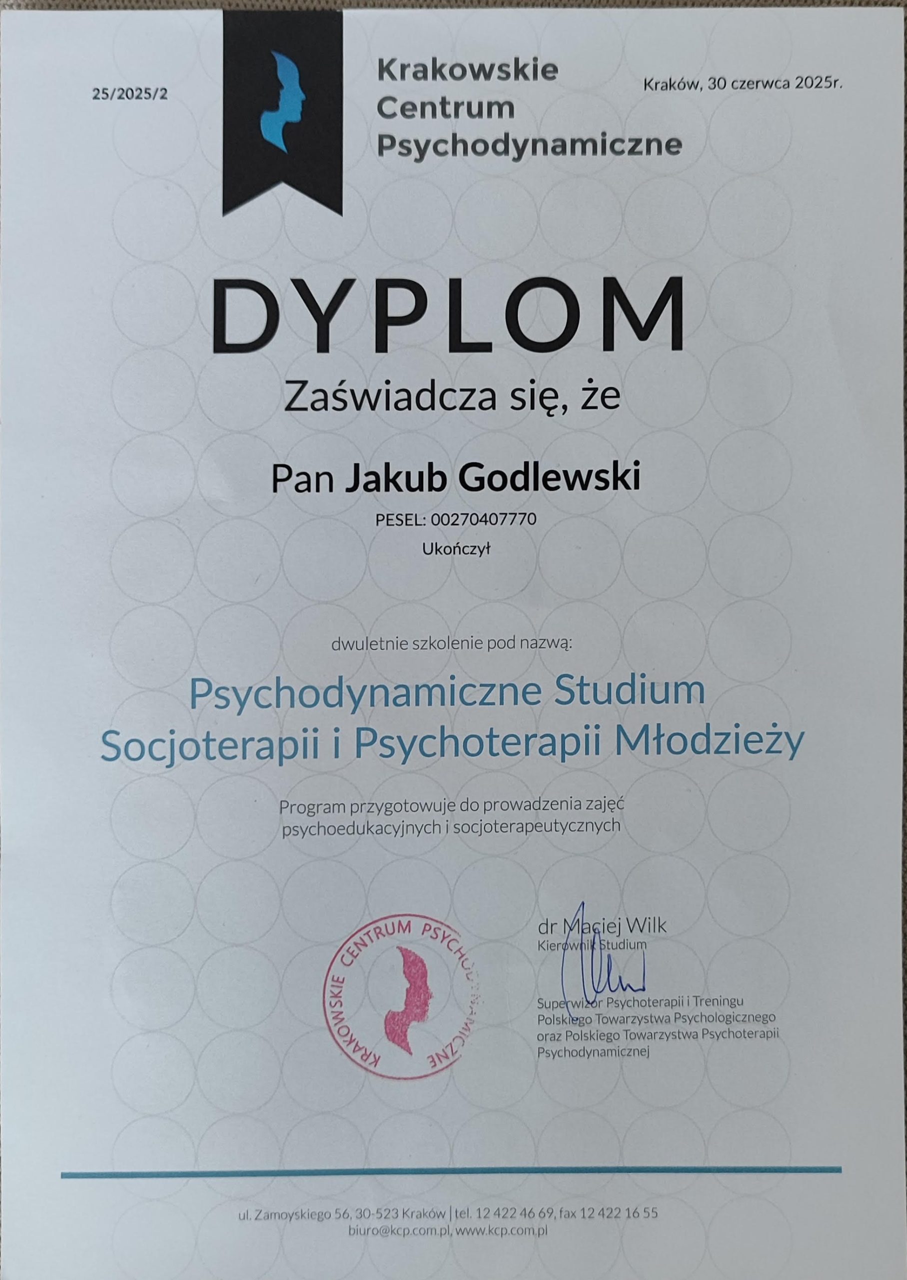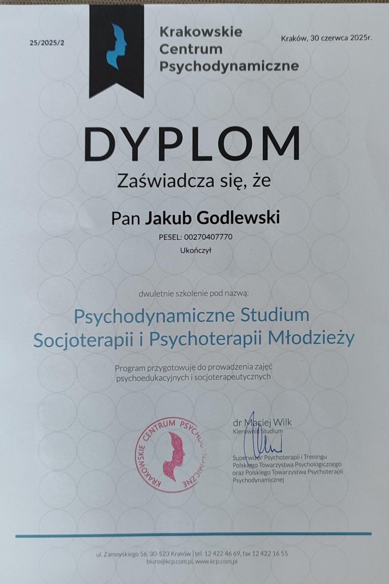 Jestem psychologiem, socjoterapeutą i psychoterapeutą w trakcie szkolenia.