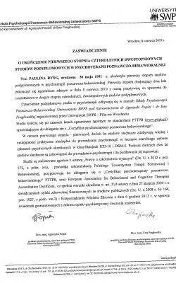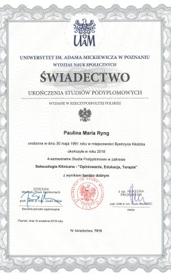 Studia magisterskie i doktorskie ukończyłam w Instytucie Psychologii Uniwersytetu Wrocławskiego. Jestem także absolwentką studiów podyplomowych „Seksuologia kliniczna – opiniowanie, edukacja i terapia” na Uniwersytecie Adama Mickiewicza w Poznaniu. Swoje kompetencje poszerzam w Szkole Psychoterapii Poznawczo-Behawioralnej, akredytowanej przez Polskie Towarzystwo Terapii Poznawczo-Behawioralnej.